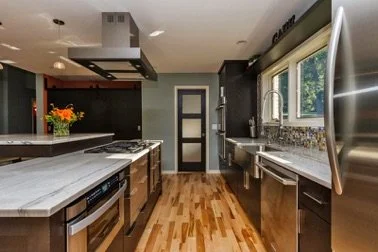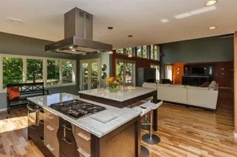 The open floor plan and absence of upper cabinets allows the cook to stay connected to the rest of the family and guests, making for a great entertaining house.