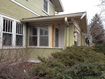 The porch of this 1919 bungalow was enclosed at some time in its history, to create a home office and a vestibule. Since the storm door was set out at the edge of the former porch, visitors were forced to step back down the steps to open the door. This created a safety hazard as well as an annoyance.